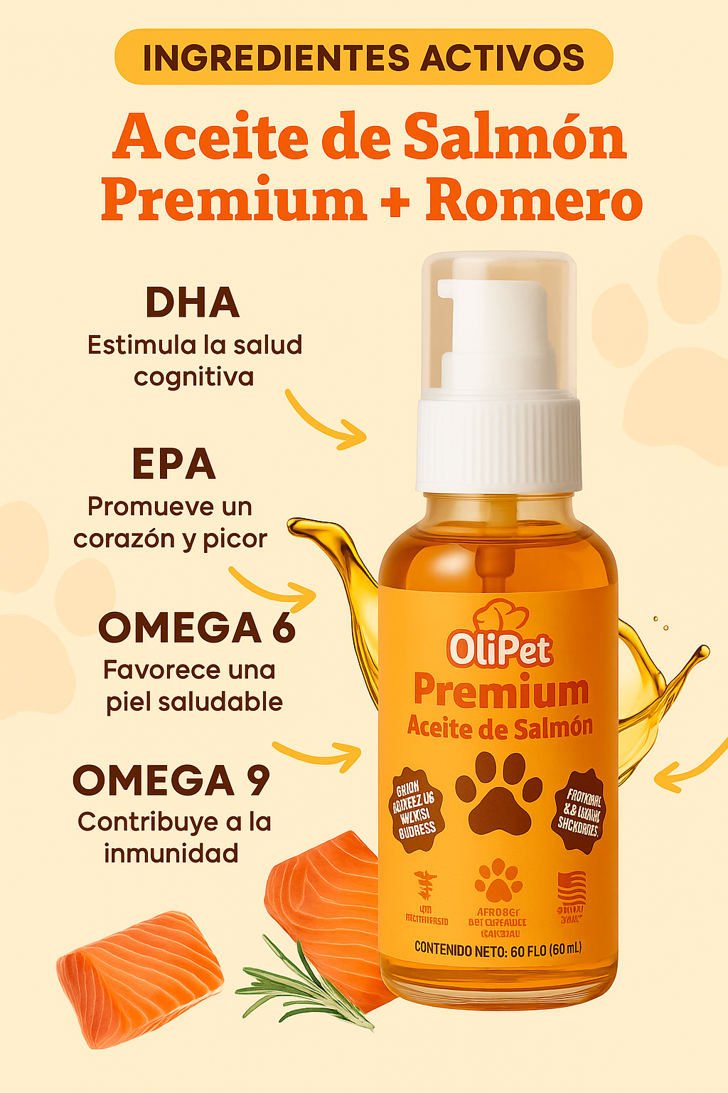 OliPet es un aceite de salmón salvaje importado desde Estados Unidos, elaborado bajo los más altos estándares de calidad y pureza. Enriquecido con Omega 3, 6 y 9, además de aceite de romero, este suplemento está diseñado para mejorar la salud de perros y gatos de todas las edades y tamaños.